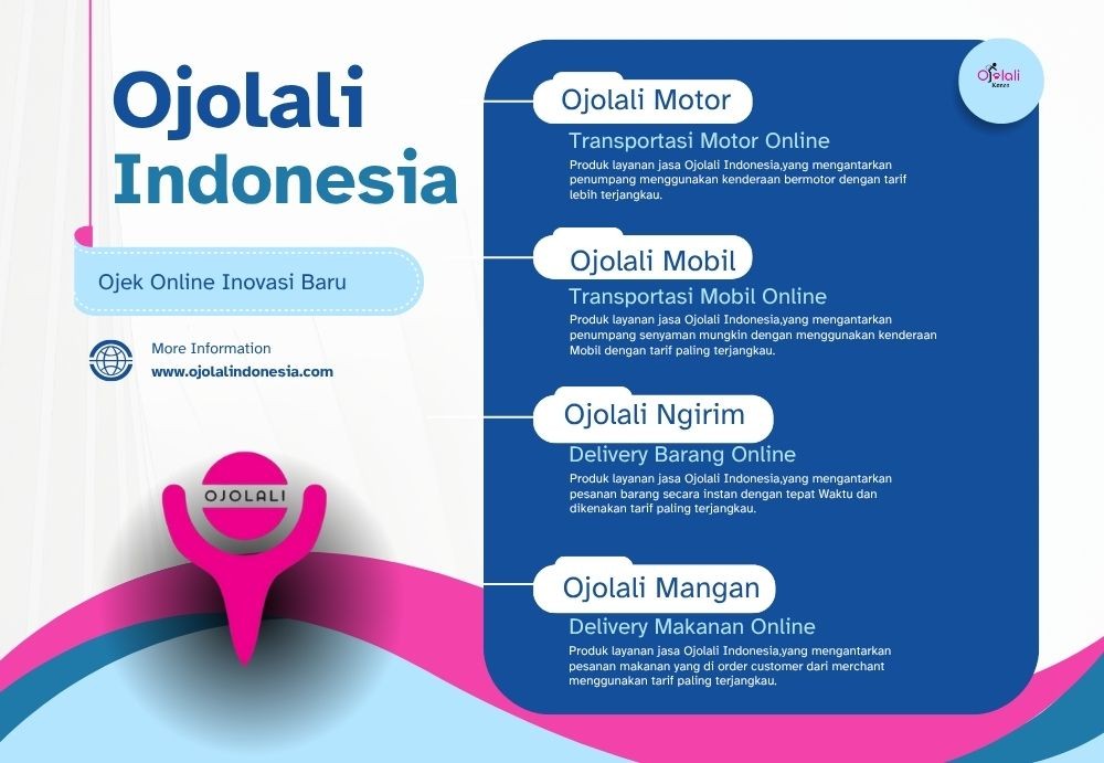 Produk layanan Ojolali Indonesia bergerak di bidang transportasi online dalam suatu kota atau daerah yang hadir diseluruh Indonesia.produk layanan sementara terbagi empat,yaitu,Ojolali motor,Ojolali Mobil,Ojolali Ngirim dan Ojolali Mangan.Dan produk ini akan terus bertambah dan update untuk melayani masyarakat dan menyejahterakan para Mitra.